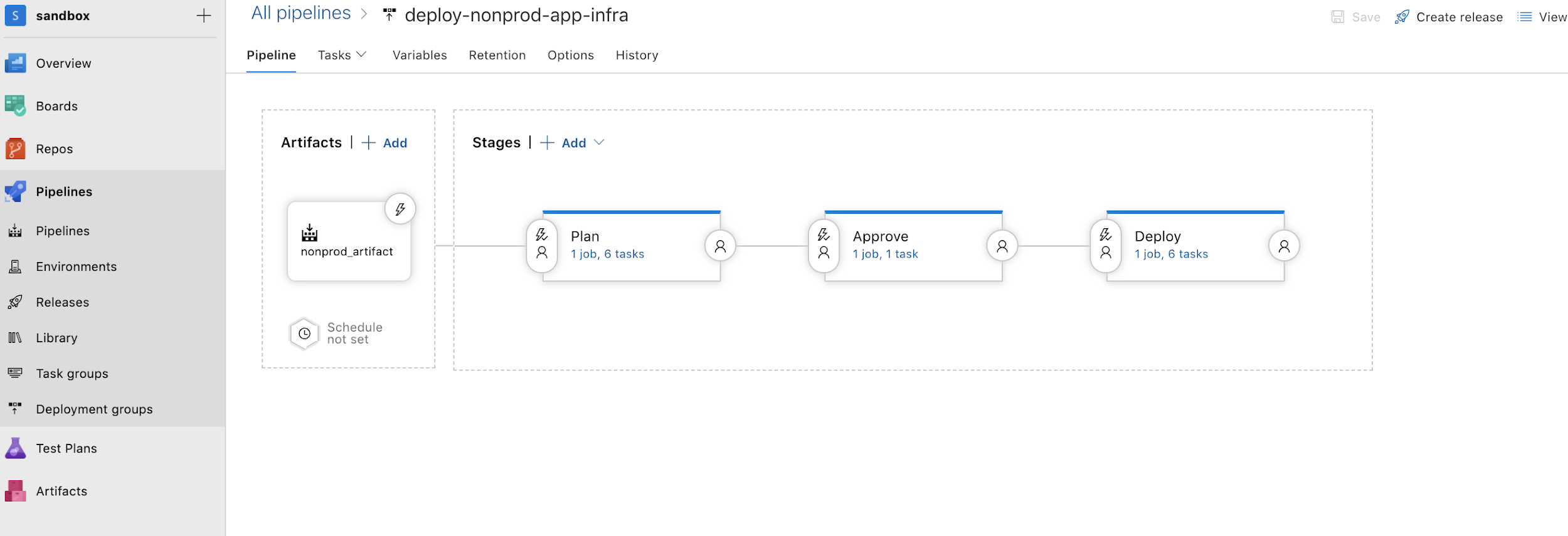 - Create a Release Pipeline: This Pipeline will allow us to set various required steps that execute our different jobs to deploy the infrastructure to the cloud.