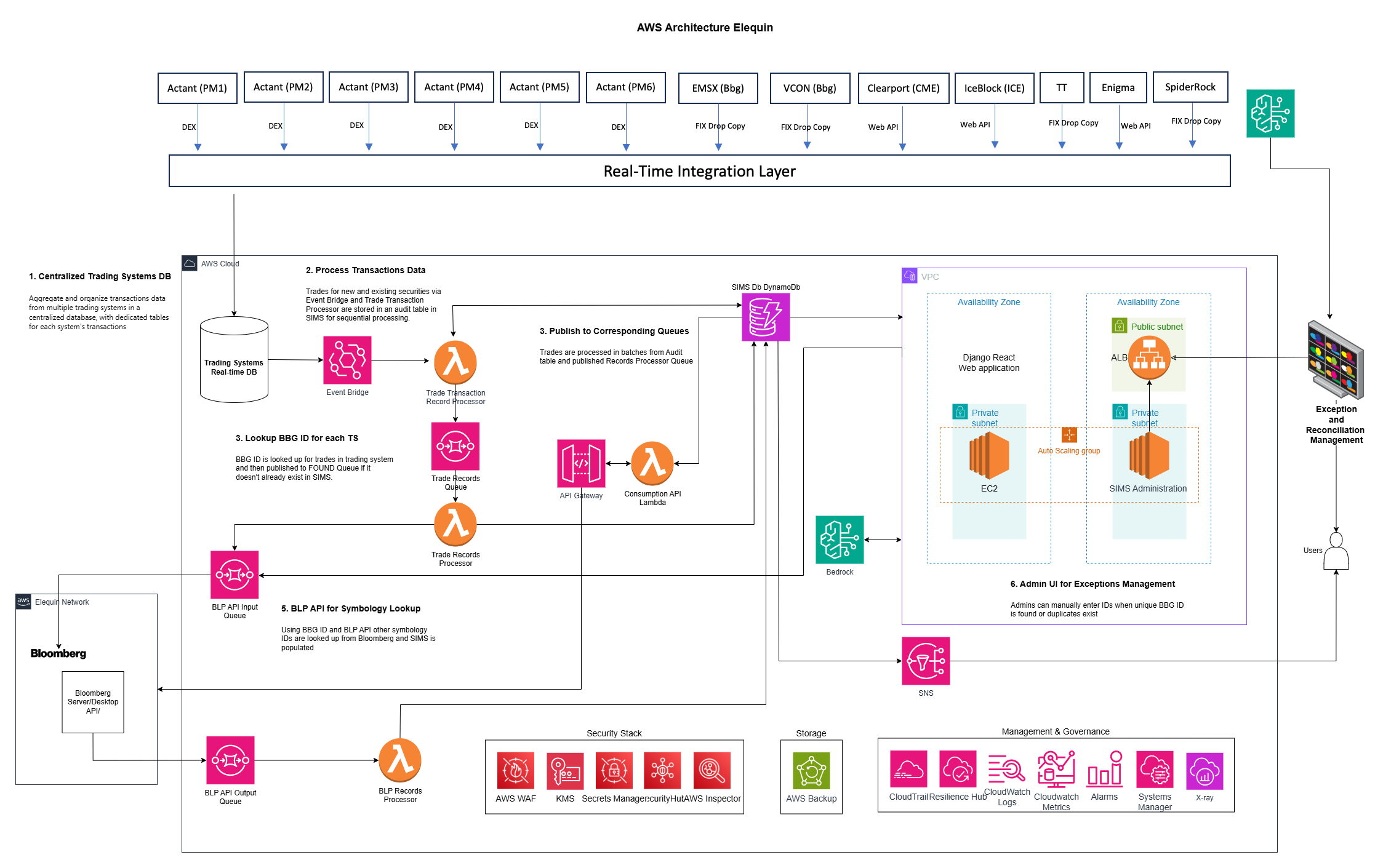 - Centralized Data Processing: All trading system data is aggregated in a centralized database, powered by Amazon DynamoDB, ensuring efficient, low-latency access to transaction data.